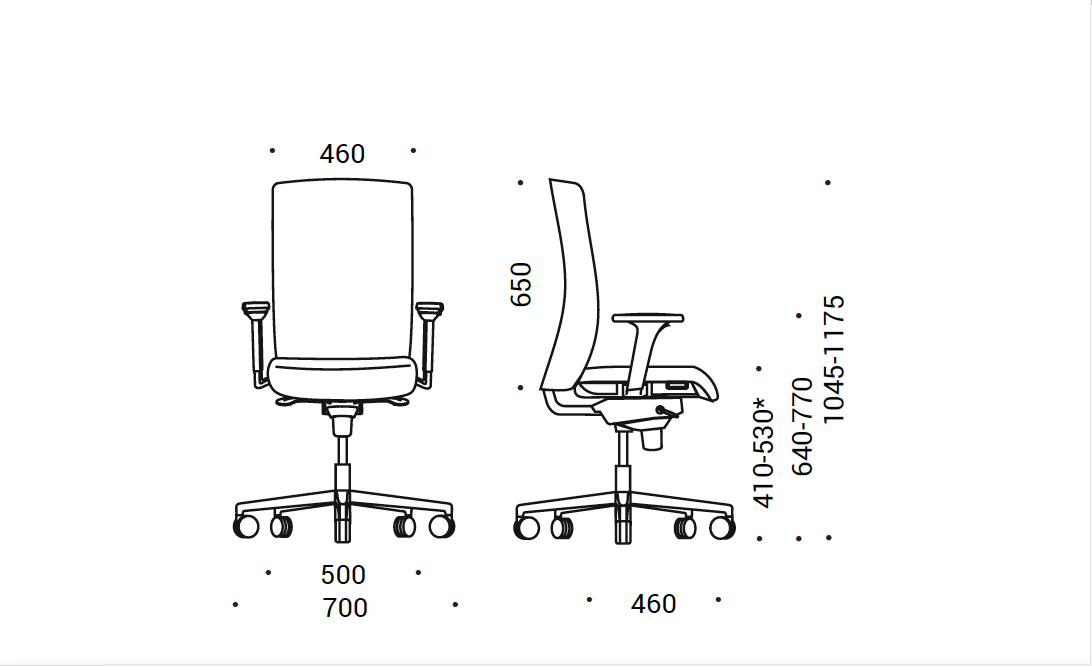 Bratele scaunului de Birou Aura sunt fixe, iar optional bratele pot fi reglabile pe inaltime din plastic negru cu partea inferioară din aluminiu lustruit prevazute cu paduri moi din poliuretan negru. Bratele reglabile se ridică pe inaltime cu 80mm.