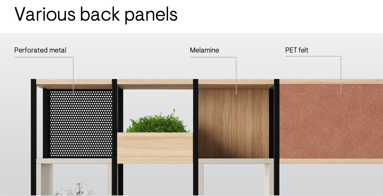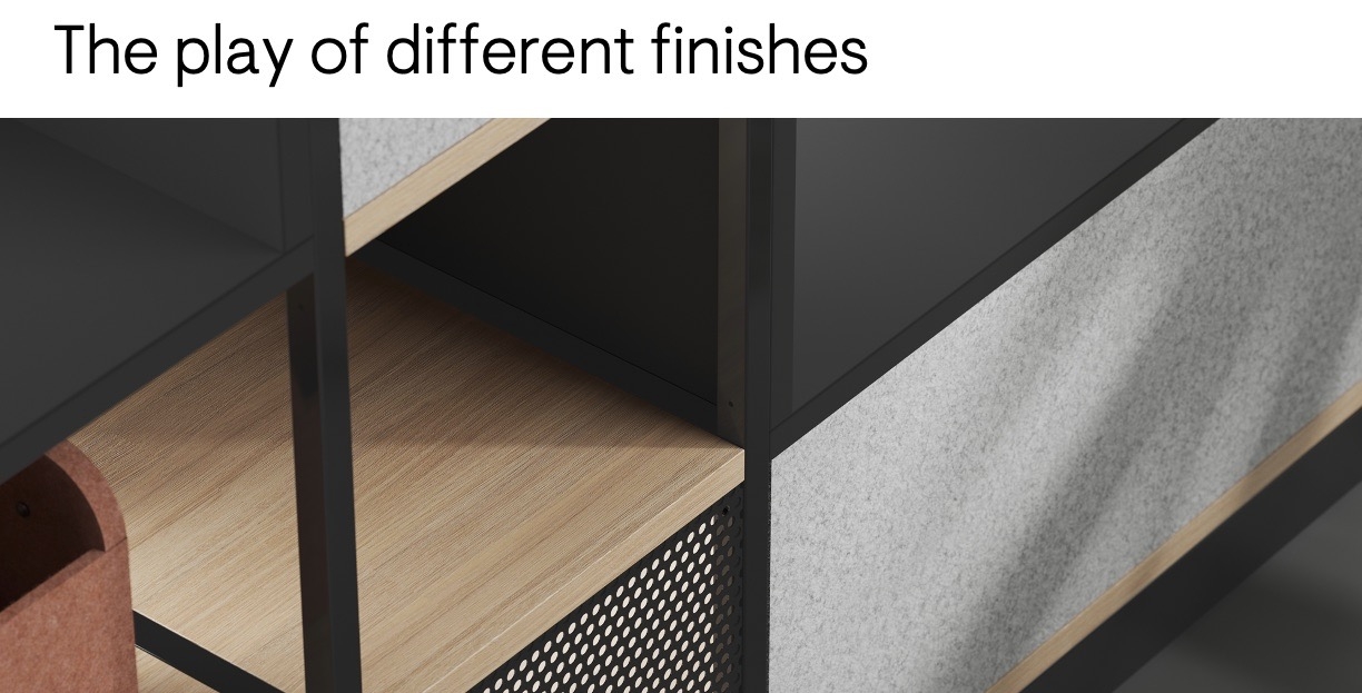 Cu rafturile mai înalte și mai închise ale colecției COMBUS, puteți adăuga intimitate și un mediu confortabil spațiilor compartimentate. Acest sistem de rafturi combină diferite finisaje și elemente de design pentru a crea combinații unice.