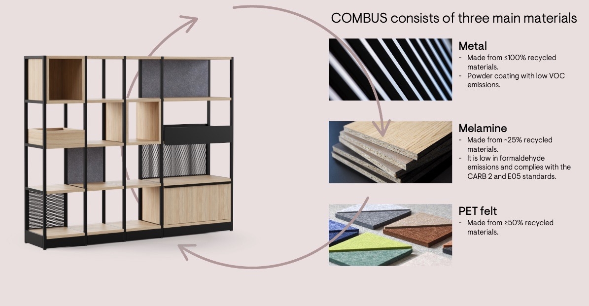 Sistemul de rafturi COMBUS a fost dezvoltat în conformitate cu principiile de proiectare ecologică. Este format din trei materii prime principale – metal, melamină și pâslă PET – care sunt parțial realizate din materiale reciclate. Reciclabilitatea COMBUS este de 99%.